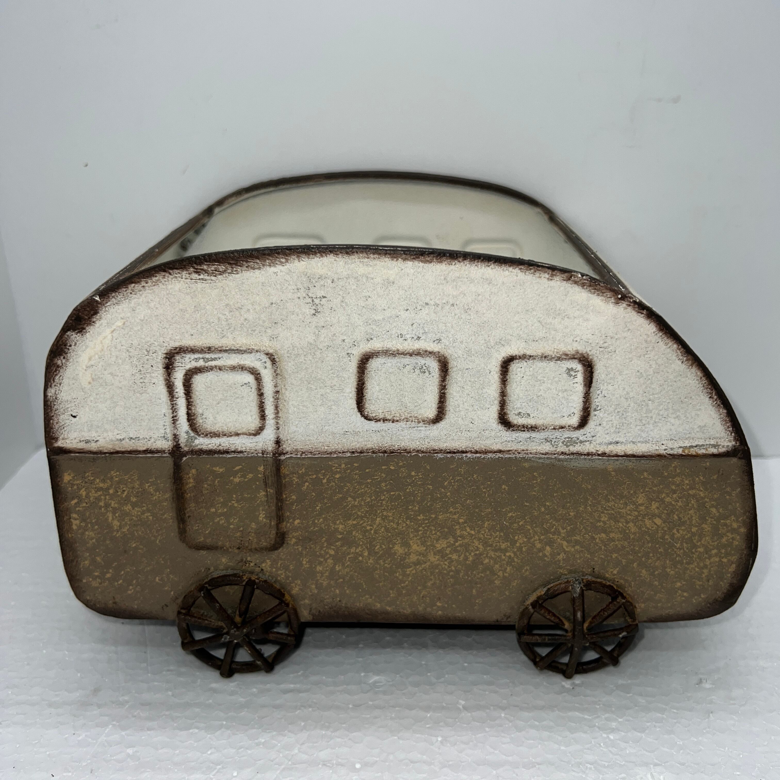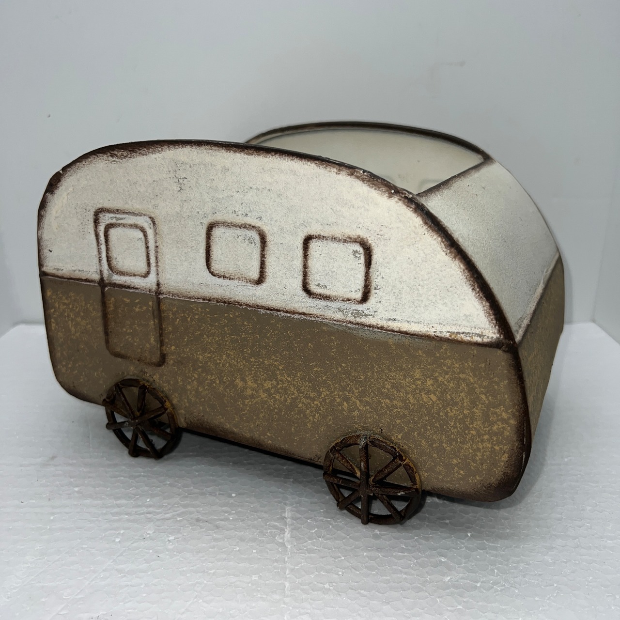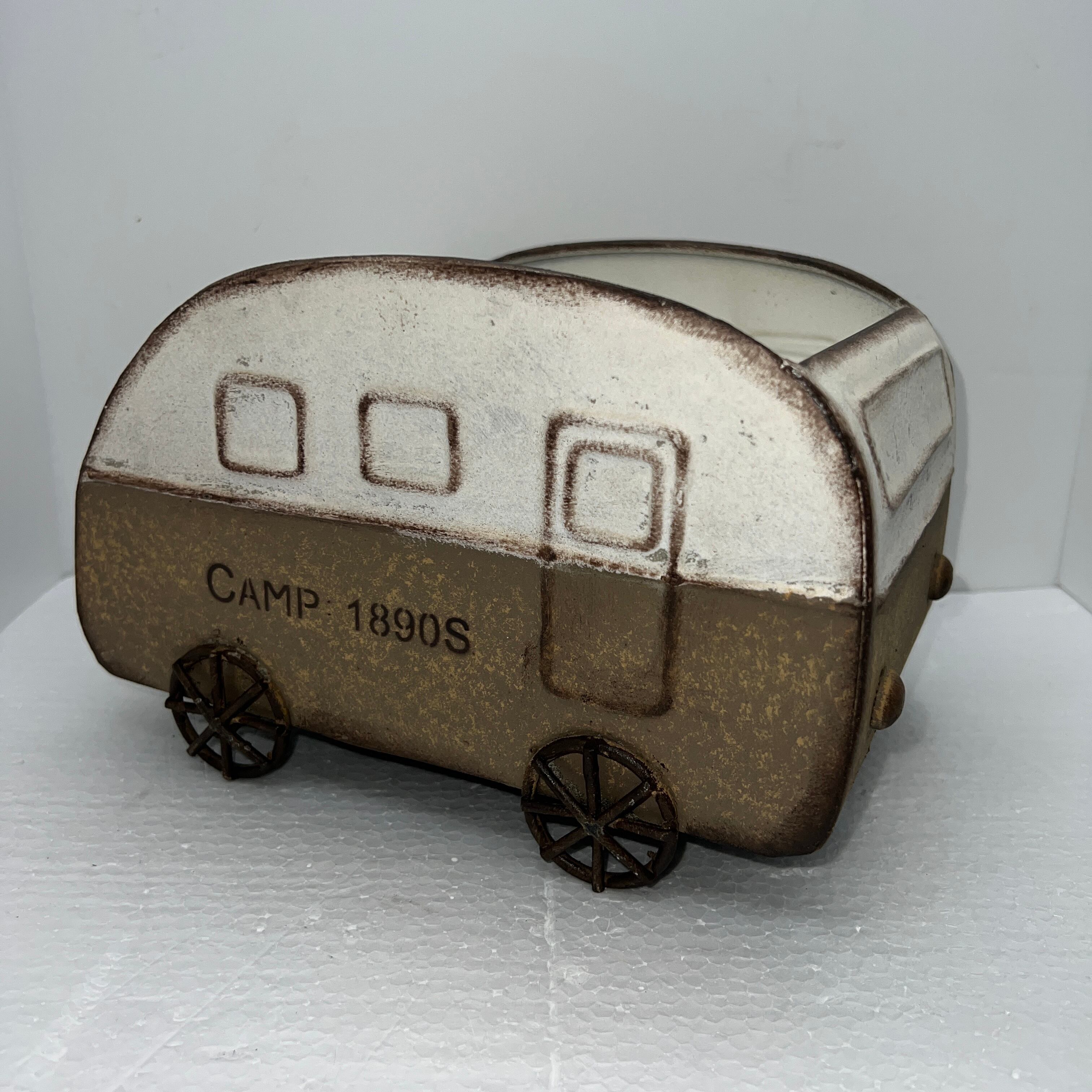 丸っこいフォルムがかわいいキャンピングトレーラー型のブリキ製のプランターです。